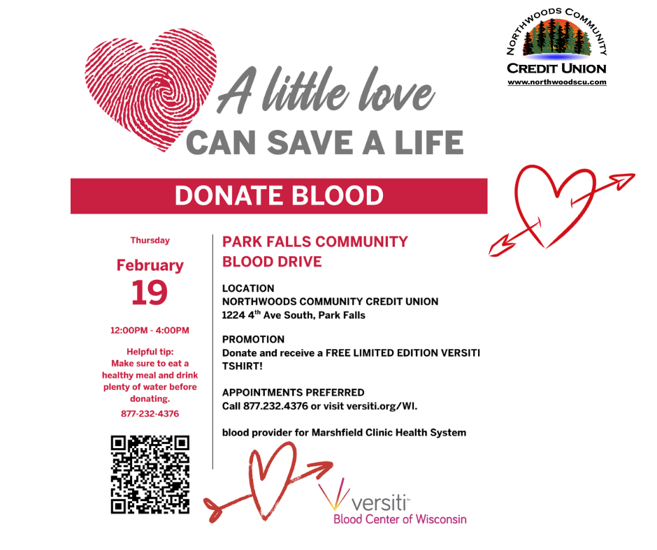 NCCU partnered with Versiti Blood Center of Wisconsin for a community blood drive right here at our Park Falls office.